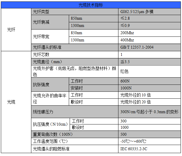 Ø特种测温光缆的技术指标,见下表。